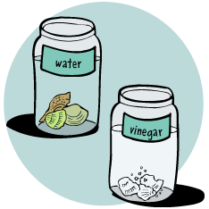 - Place a few seashells in one jar and add 1/2 cup vinegar.
